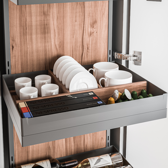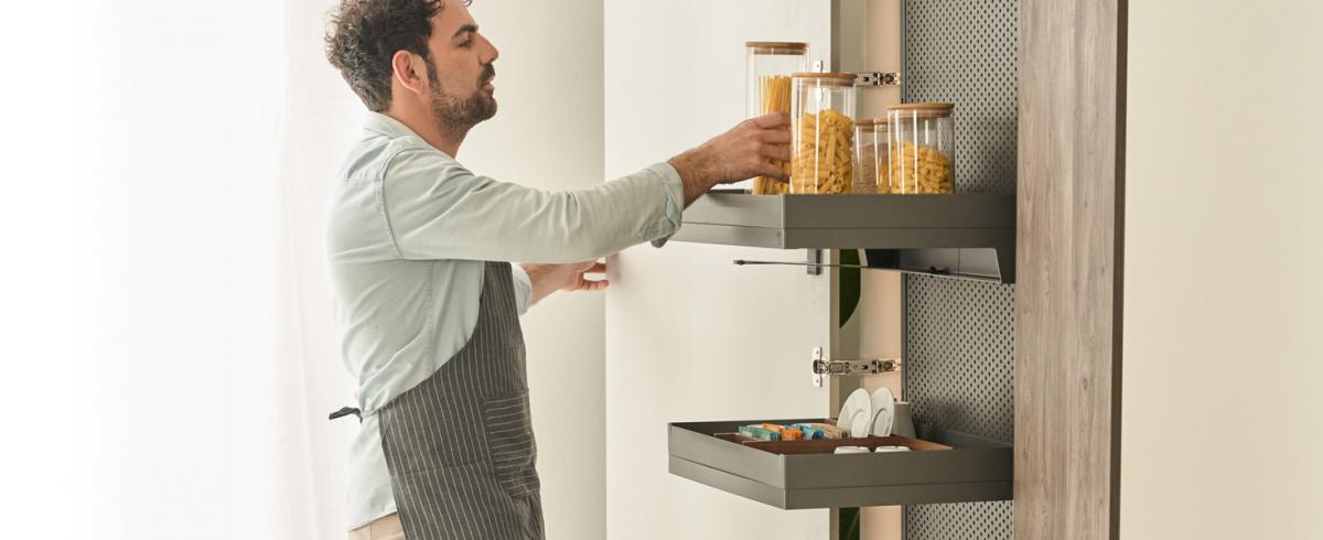The award-winning Sous-Chef line by Gollinucci is enhanced with Sous-Chef High, a new set of accessories for kitchen rack furniture. The Sous-Chef High line has a variety of models, finishing and optional items. The use of spacious and elegant resin trays is of particular importance, since they represent a trademark of the whole Sous-Chef line.The rack components can be made of either wood or metal. The possibility to add lights inside the rack together with special metal sheet backrests is very fascinating, thus enhancing the elegance and rigour of the lines.